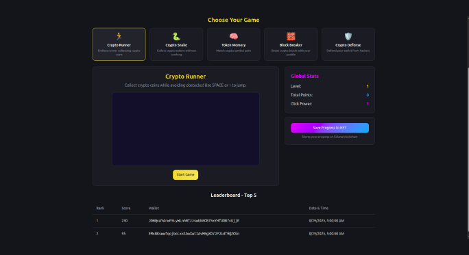 - Multi-game crypto hub with on-chain scoring.